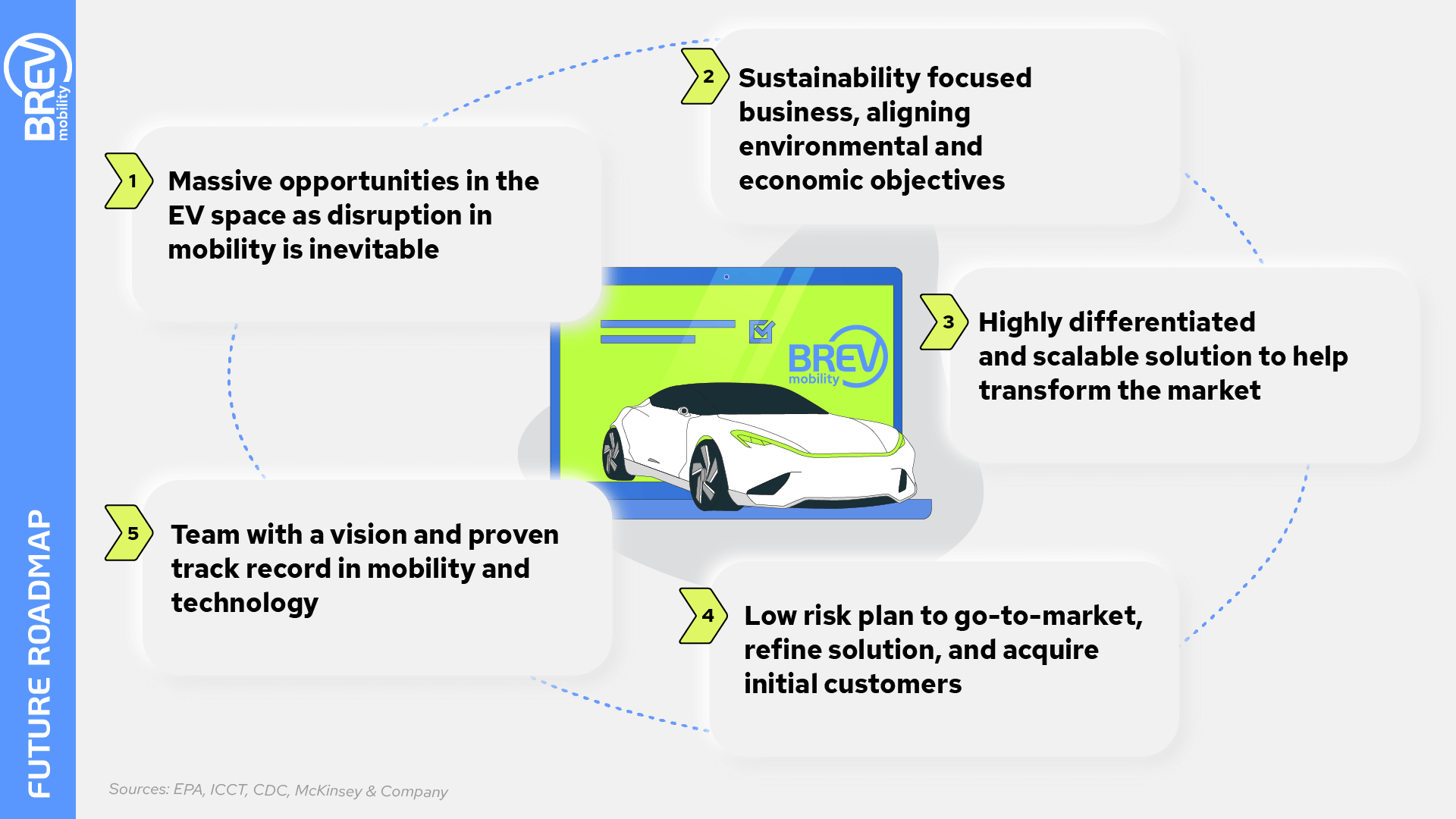 Realizing the value of a good first impression, Deneeze developed a branding and marketing strategy just as innovative as EV technology. Brev’s vision is based in social awareness, eco-friendly service, and the mission to make EVs accessible for all people. We also knew that determining who could benefit from Brev’s services was key to bringing that vision to life. And that strengthening Brev’s position could be achieved by optimizing revenue projections and reducing market risks and threats of competition. Thanks to extensive market research and consultations with the client, Deneeze built a plan for success.