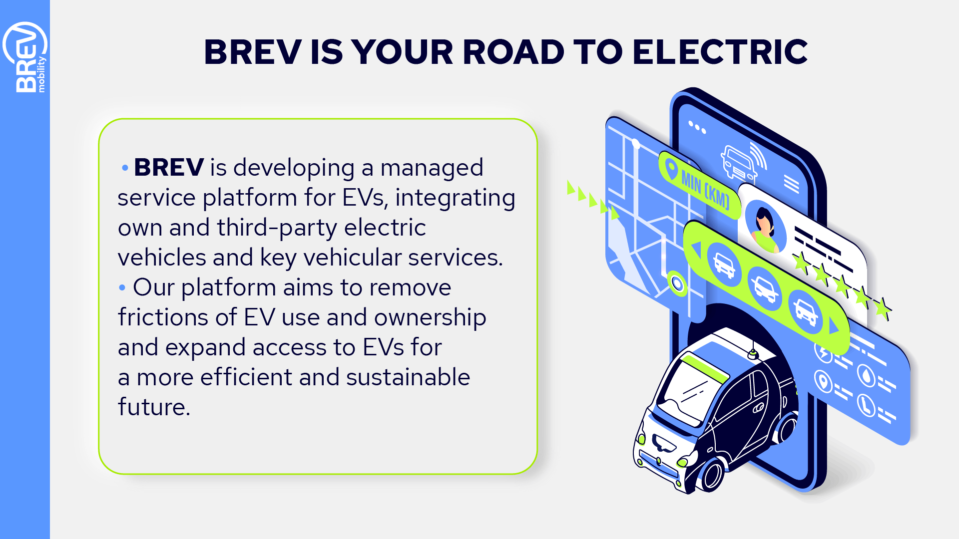 Electric vehicles (EVs) are the clear future of personal and public transportation. But accessing and owning EVs can be a bit more complicated. Brev exists to change that. By streamlining key functions for EV management and operation into a single app, Brev simplifies EV ownership and offers EV sharing for a more equitable and sustainable future. Brev had the vision, they simply needed to have their message heard. To launch their brand, generate support from key stakeholders, and begin changing the future of mobility, Brev contacted Deneeze.